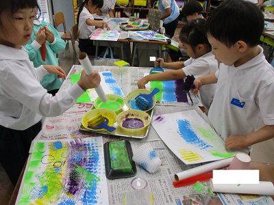 ローラーや身近にある材料に絵の具をつけて、形を紙に写して楽しみました。