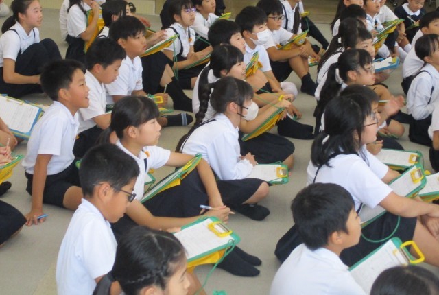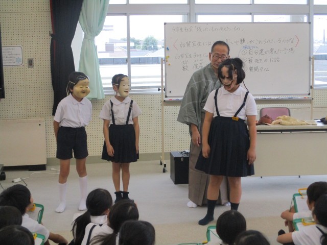 加賀宝生の歴史やそれに関わる人たちの思いについて熱く語っていただき、最後には、児童が面をかけてもらう場面もありました