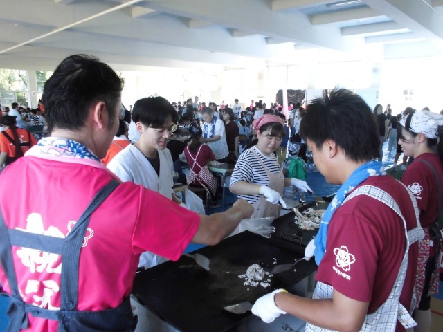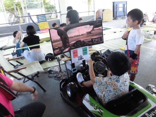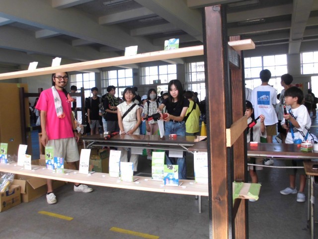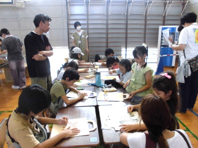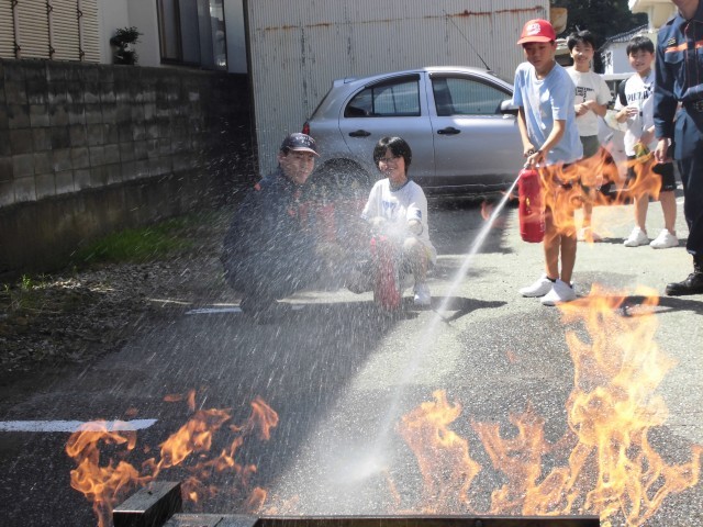 毎年恒例の親父のポテトやOBの焼き鳥、先生特製焼きそばなどの食べ物屋さんや、射的や千本引き、くじ引きなどのお祭りっぽいお店に加え、今年度は、エコバック作りやシュミレーター、警察や消防の方に協力していただいて消火体験や自転車交通安全クイズなどのコーナーも新設され、今年も大盛況でした。