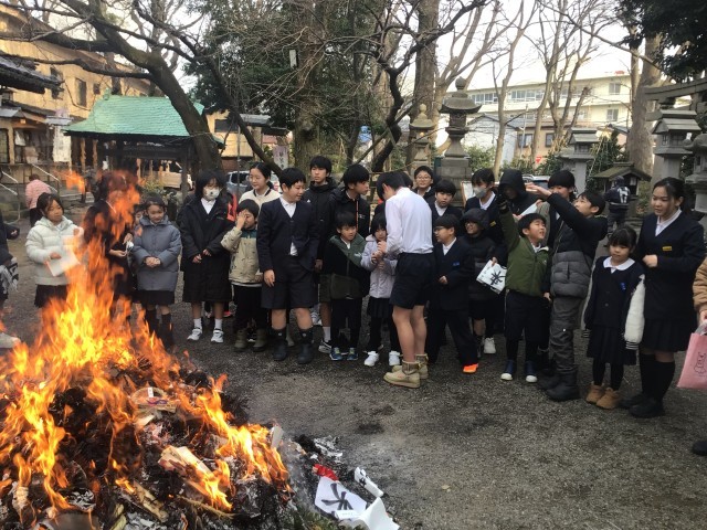 学校で飾っていたしめ縄や書初め、家から持ってきたお守りなどを燃やし、みんなで幸せや上達を願いました。