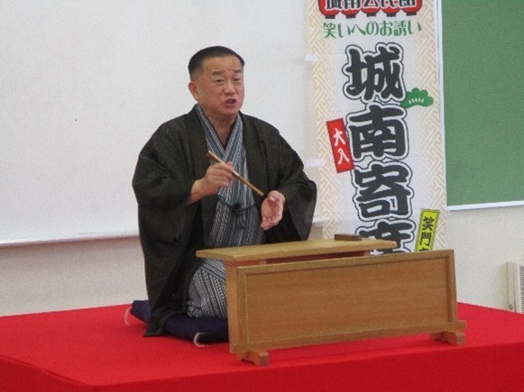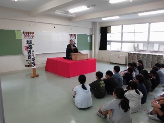 城南公民館による「城南子ども寄席」が5・6年生を対象に行われました。上方落語で活躍されている桂文我師匠をお招きして行われたこの会では、マルテ教室に高座を設けて、まるで本物の寄席にいるかのような雰囲気で落語を楽しむことができました。