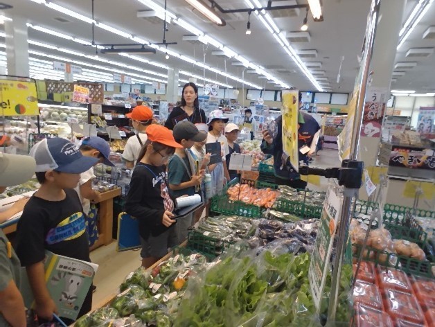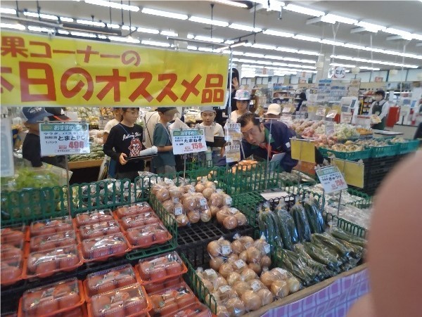 最初に、店長さんから、店内の案内をしてもらいました。「産地地消」に力を入れているお店ということで、入り口には「じわもん販売コーナー」が大きく設置していました。精肉や魚を、さばいたり袋つめしたりする「バックヤード」にも入らせてもらい、スタッフの皆さんがお仕事している様子も見せていただきました。