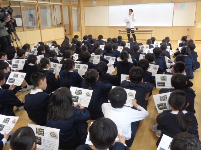 1月15日(木)の給食は、郷土料理の献立で「かぶととりにくのじぶにふう」でした。石川県商工労働部産業政策課の「加賀料理の魅力発信」という事業の一環で、大友楼の大友 佐悟 さんが治部煮について説明をしてくださいました。煮る時にじぶじぶと音がするので治部煮と名前がついたという話や、治部煮を美味しくいただくために作られた治部煮椀があること等について教えていただきました。治部煮について学んだ後の給食は、いつも以上に美味しかったようです。