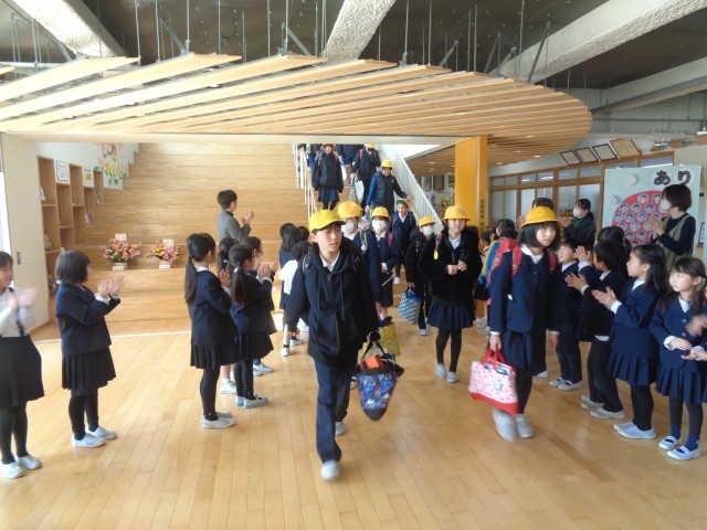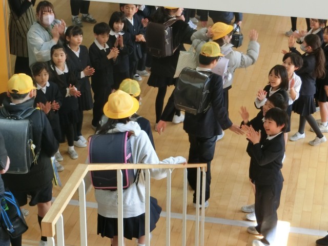 6年生のお見送り 公開日 2026/03/16 更新日 2026/03/16 学校生活の様子 明日、卒業を迎える6年生のお見送りをしました。1年生から5年生が廊下に並び、温かい拍手で6年生を見送ることができました。6年生と手を振り合う姿やハイタッチする姿が見られ、心が温かくなる時間となりました。