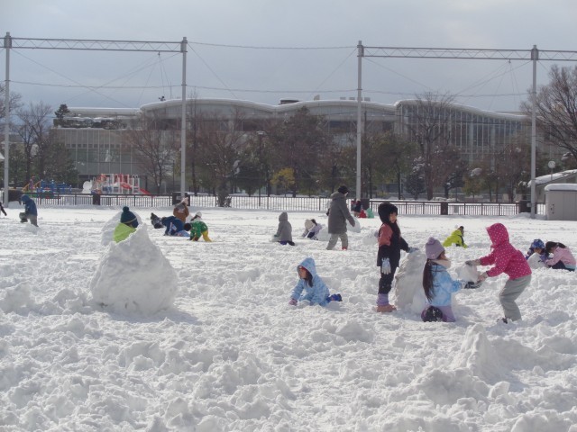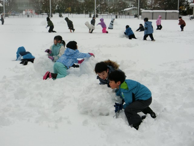 少しでも雪が積もっていると、運動場に飛び出し、雪遊びを楽しむ子ども達がたくさんいます。雪合戦や雪上鬼ごっこ、雪だるまづくりなど、思い思いに雪遊びを楽しんでいます。
