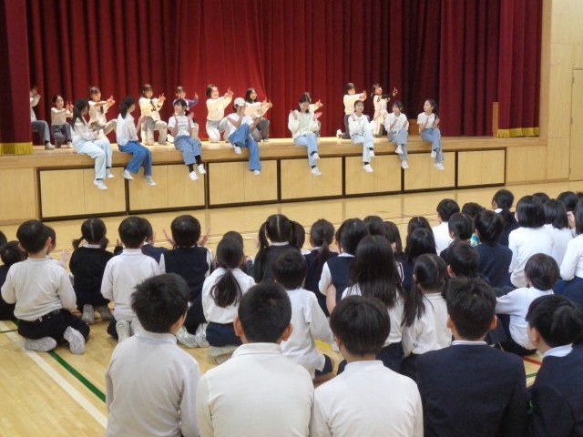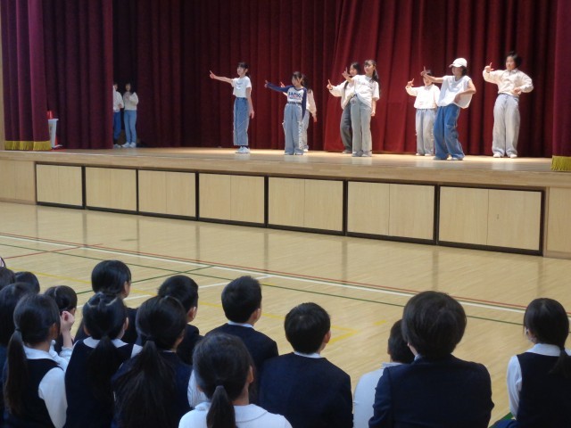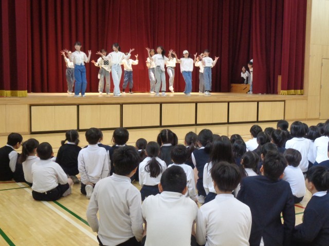 1月30日(金)の昼休み、ダンスクラブの子ども達が、クラブ活動の時間に練習したダンスを発表してくれました。たくさんの子ども達が見守る中、音楽に乗ってリズムよく、キレのあるダンスを披露してくれました。みんなで練習を積み重ねてきたことが伝わってきました。ダンスの他にも、子ども達自身が発表会の流れを考えたり司会をしたりと、主体的な姿がすばらしかったです。