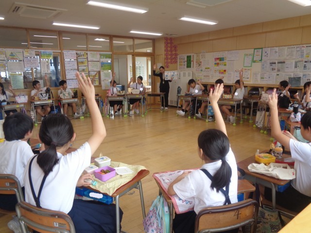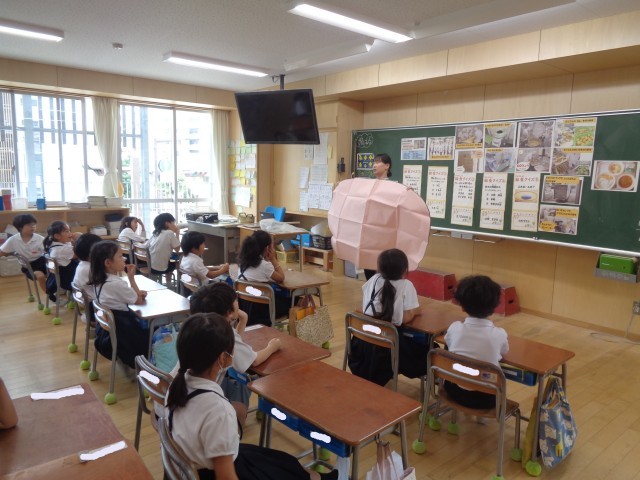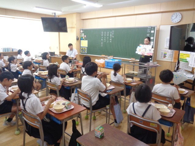 栄養教諭の吉野先生や岩﨑先生、中央共同調理場の教育実習生の米澤先生が、食育を行ってくれています。1年生では、給食ができるまでの様子や実際に使っている鍋やしゃもじの大きさを教えていただきました。1年生は、しゃもじの大きさと重さに驚いていました。また、他の学年では、カルシウムの大切さについてのお話をしてくださいました。「牛乳が給食に毎日出るのはそういうことか・・・」とつぶやく子がいました。自分で食事を考えるきっかけになったのではないでしょうか。カルシウム不足にならないように気をつけたいですね。
