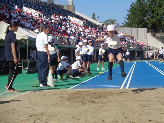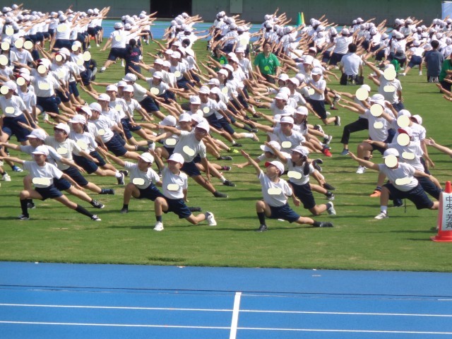 10月2日(木)、金沢市立小学校に通う6年生約3,700人が参加し、連合体育大会が行われました。本校の6年生も参加し、50m走やチャレンジ種目に挑戦し、「記録が伸びた」と喜ぶ姿がたくさんありました。また、「若い力」では、切れのある動きで観ている人たちを魅了しました。学校対抗リレーでは、選手は全力で走り、観客席では仲間への熱い声援が送られました。翌日の全校朝会で、挑戦する素敵な姿を見せてくれた6年生に1~5年生みんなから大きな拍手を送ることができました。6年生のみなさん、素敵な姿をみせてくれてありがとう!