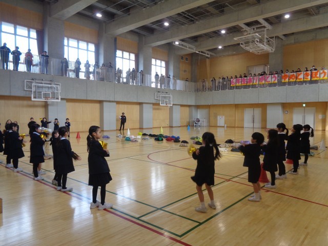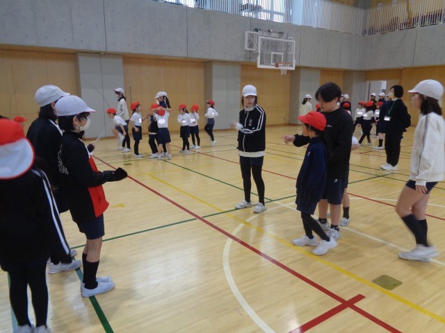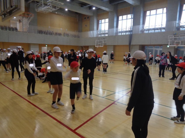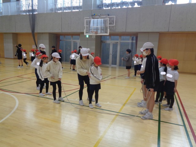 2月6日(金)、今回は6年生に長縄跳びの8の字跳びを教えてもらいました。6年生は、長縄に入るタイミングを教えたり、タイミングよく背中をポンと押してあげたりしてくれました。1年生に優しく教えたり声をかけたりする6年生、6年生と一緒でにこにこの1年生。寒い体育館でしたが、心はぽかぽかになりました。