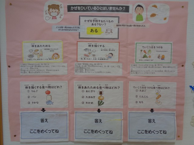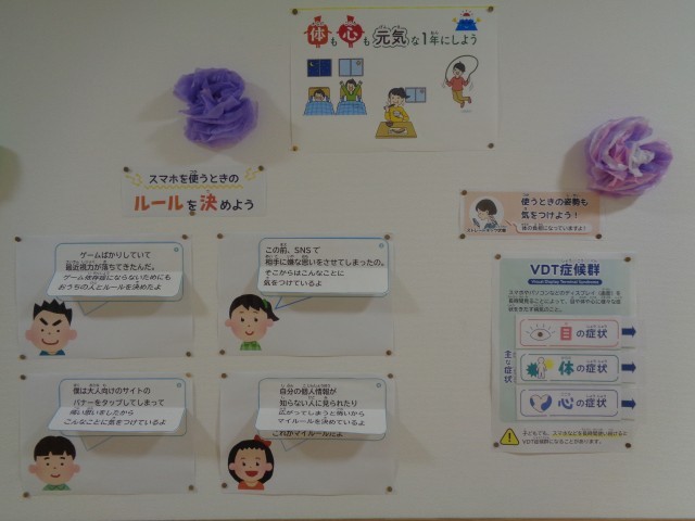 子ども達が心も身体も元気に過ごせるようにと、保健室の谷口先生、給食の吉野先生と岩﨑先生が、廊下の掲示を工夫してくださっています。風邪を予防する食べ物、元気に過ごすためのバランスのよい食事のことを知る掲示や、スマホを使うときのルールやマナー、姿勢について知る掲示。クイズだったり、自分で選んで貼ったりするなど工夫されているので、子ども達は、足を止めて掲示物をみています。子ども達が毎日、元気に過ごすことを願っています。