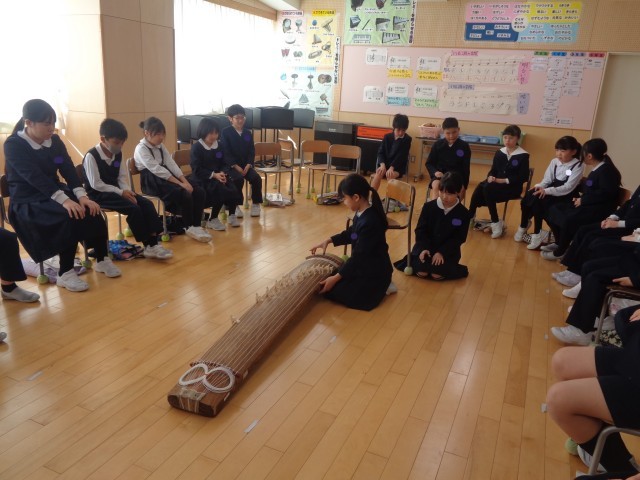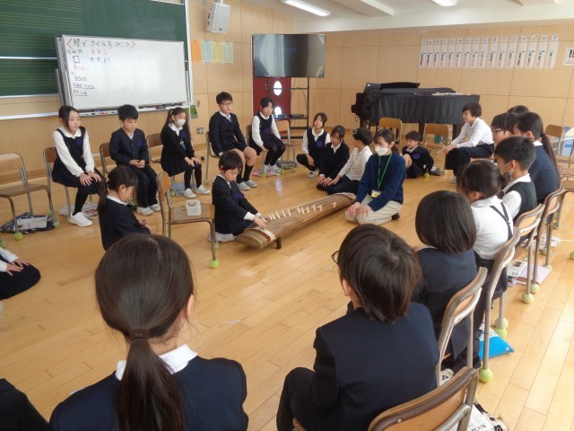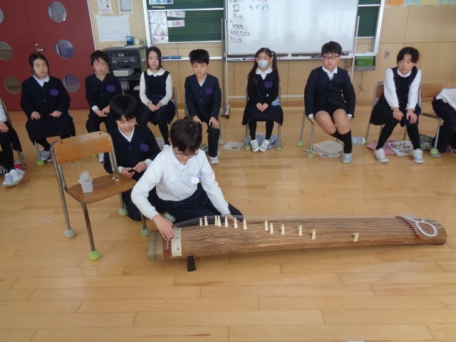 4年生は、音楽で「日本の音楽でつながろう」という学習の中で、琴をひく体験をしています。琴の演奏の仕方を知り、「さくら」の始めの部分を実際に演奏します。「さくら」の音が奏でられると嬉しそうな表情を見せ、友達の奏でた琴の音色を楽しんでいました。