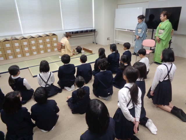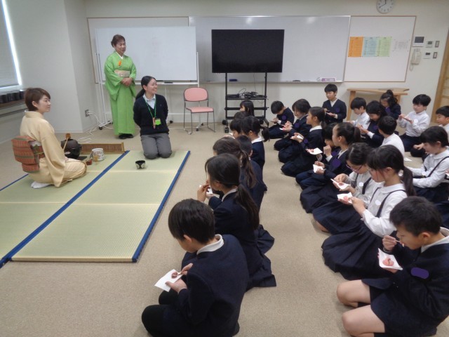 2月13日(金)、3年生は、総合的な学習の時間の金沢ふるさと学習「金沢の和菓子・茶道文化を学ぶ」の学習で、茶道体験をしました。お点前を見せていただいたり、お抹茶や和菓子をいただいたりしました。お抹茶は、自分で点ててみましたが、分かりやすく教えていただいたおかげで、みんな上手に点てることができ、美味しくいただきました。和菓子をいただき、「いつも食べているお菓子と違ってやさしい味がした。」「風味がある。」と話す子がいました。子ども達の表現もすてきでした。子ども達の茶道体験のために、ご指導いただき本当にありがとうございました。