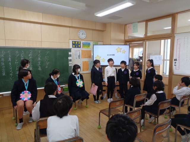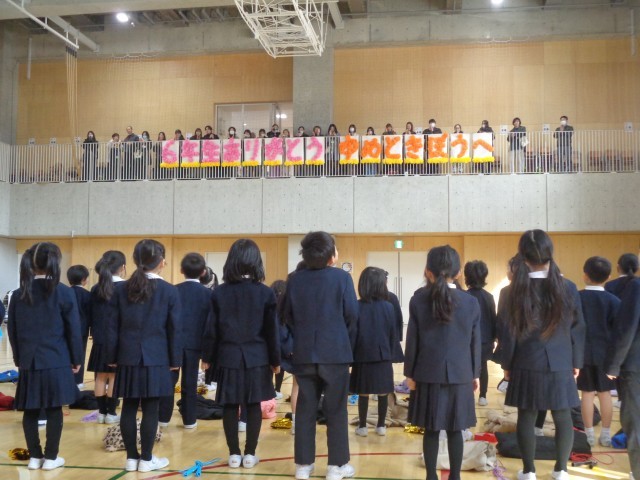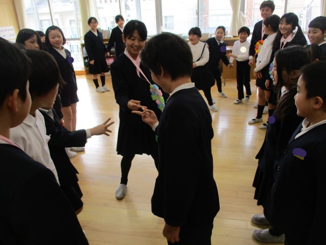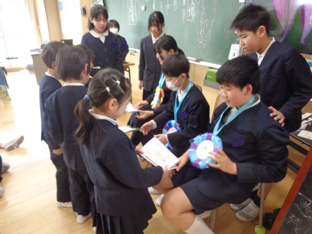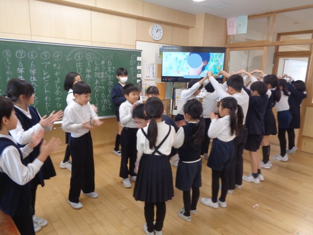 2月20日(金)、6年生を送る会に続いて、昼休みの時間になかよしお別れ会を行いました。先週のリハーサルのおかげで、これまで一緒に活動してきた6年生と一緒にゲームをしたり、お手紙を渡したりと、楽しい時間を過ごすことができました。5年生は、「うまくいってよかった。」「1~4年生も、お願いしたことをしっかりとしてくれて嬉しかった。」と話してくれました。6年生からは、「こんな会をしてくれてうれしかった。」「最高の1日!」などの声が聞かれました。子ども達の温かい気持ちがいっぱいの1日でした。