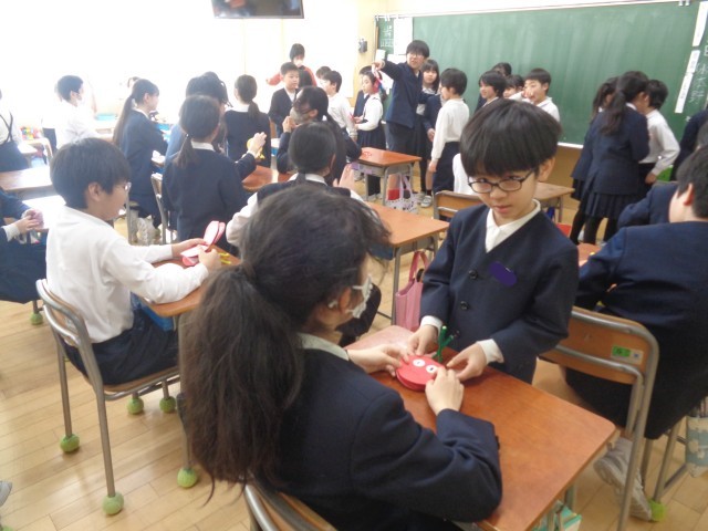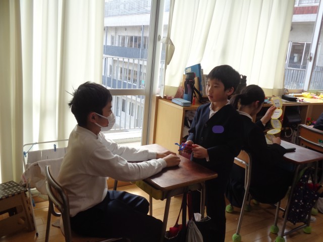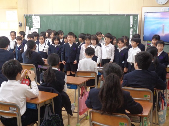 2月18日(水)、2年生は6年生を送る会の招待状を作り、6年生に届けました。メッセージには、感謝の気持ちが書かれていました。渡したい渡したい相手が見つからない2年生に「あそこにいるよ」とやさしく教える6年生、プログラムがを受け取りにっこりの6年生。緊張していた2年生も、6年生の笑顔を見てにっこり。教室が温かい空気に包まれました。送る会が楽しみになったようです。