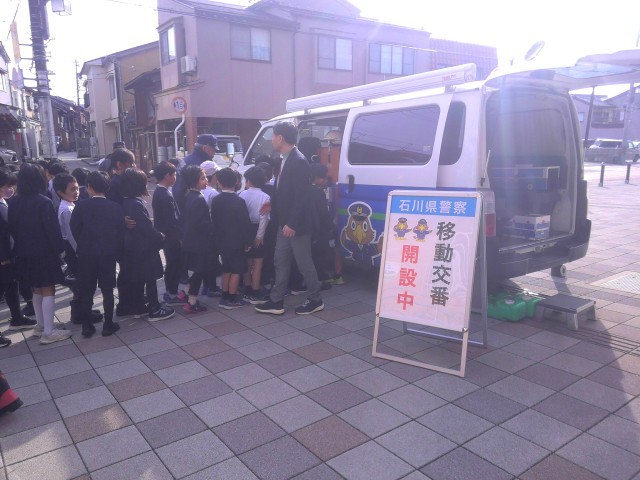 県警から移動交番がやってきました。3年生は社会科の学習「事故や事件からくらしを守る」として中を見学させていただきました。さまざまな道具があり,驚きました。