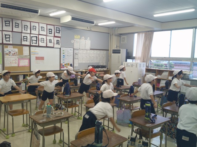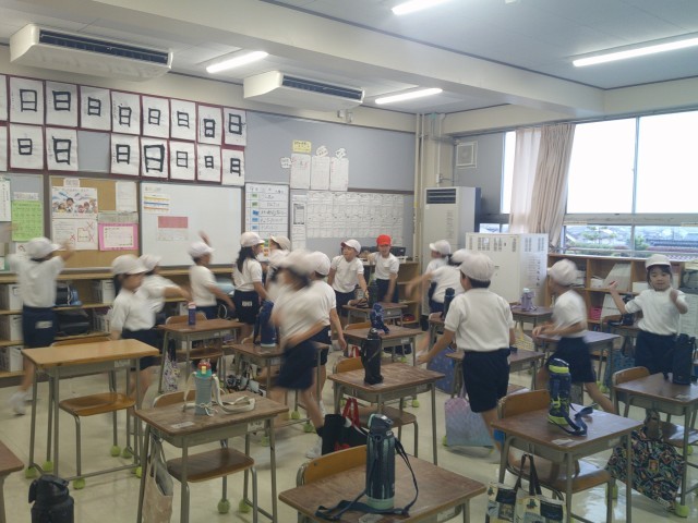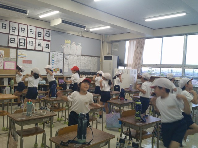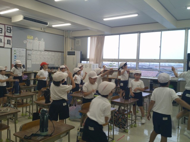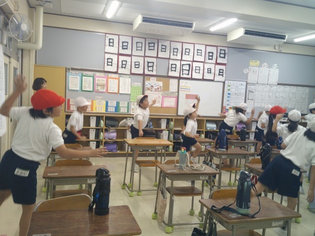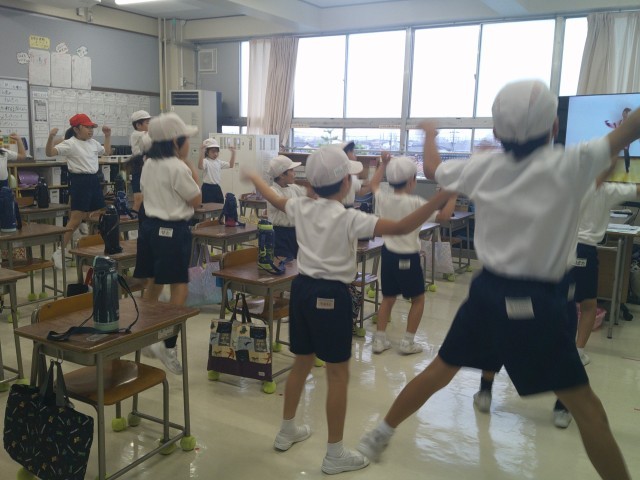 体育の授業のウォーミングアップで、運動会で踊る『よっちょれ』の練習をしていました。みんなとても楽しそうで、笑顔いっぱいで踊っていました。かけ声もだんだん大きくなって、教室中に響いていました。