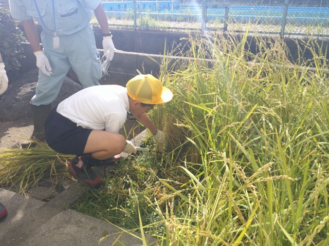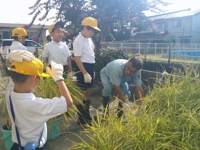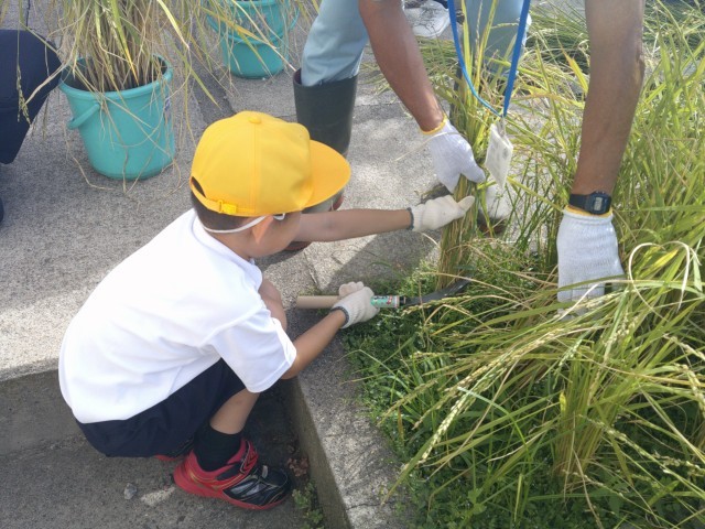 今日は嬉しい稲刈りの日です。上の学年の子たちは、慣れた手つきで鎌を使って稲を刈っていました。稲刈りが初めての1年生も、たくさん刈っているうちに、だんだん上手に鎌を使えるようになりました。試しに育てたバケツ水田の稲刈りも終えて作業終了です。