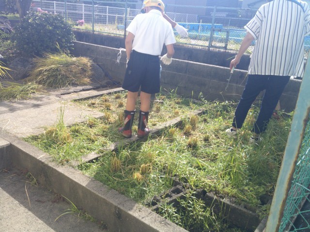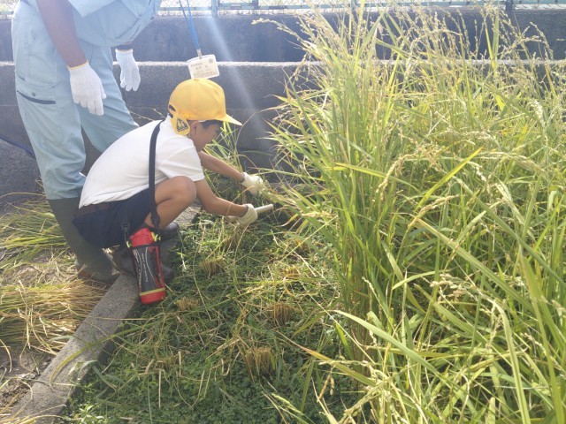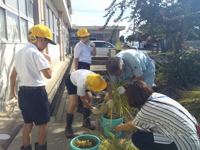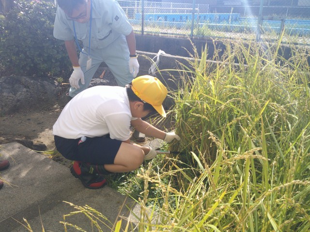 学校の田んぼは、能登半島地震以来水漏れがひどい状態です。また、夏の暑さが続いて生育にも影響が出ています。それでも、みんなで田んぼに水を入れたり、草むしりをしたりしてお世話を続けてきました。