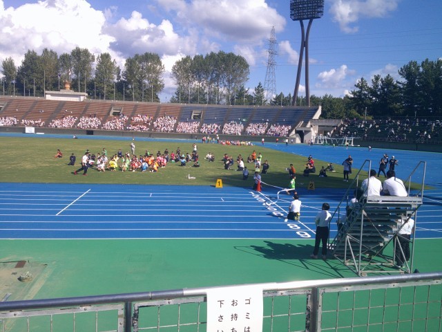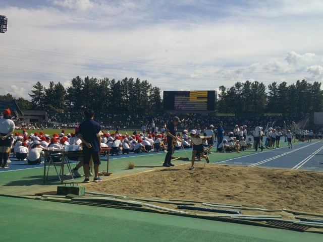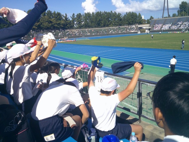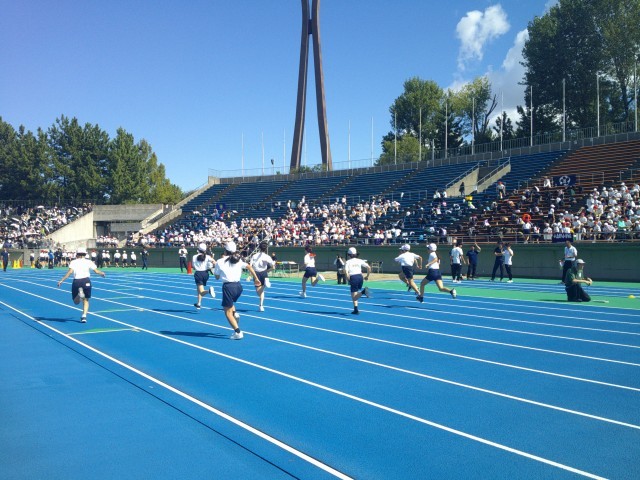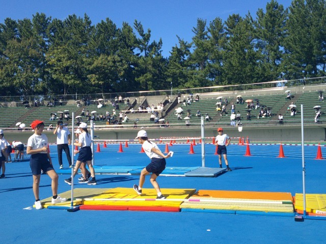 午後のチャレンジ種目では、走り幅跳び、走り高跳び、100m走、持久走(約800m)から、1種目に挑戦し、記録の更新をめざしました。『学校対抗リレー』は、4人の代表の力走が光っていました。スピードにのったバトンパスは、練習の成果が出ていました。他の学校を大きく引き離して1位でゴール!スタンドで応援する仲間の声もしっかりトラックに届いていました。