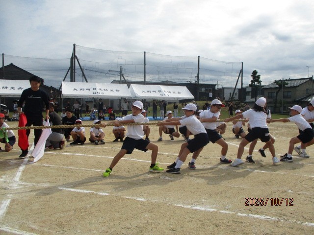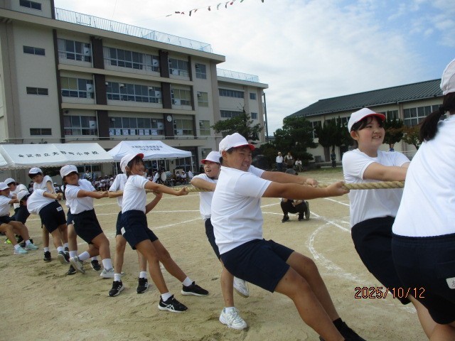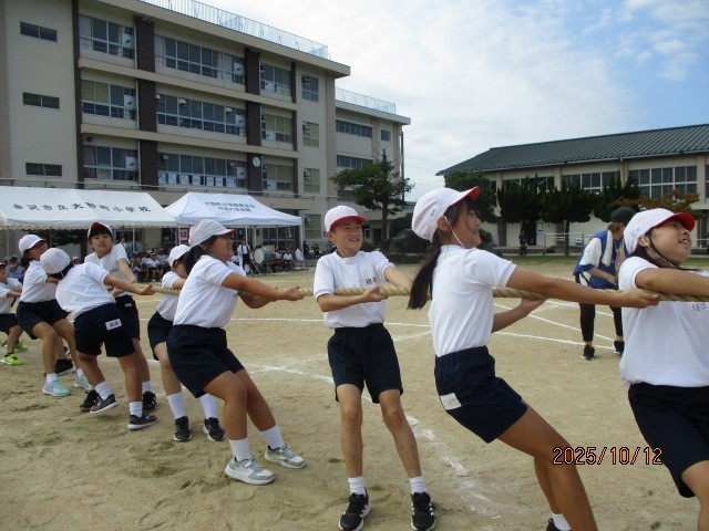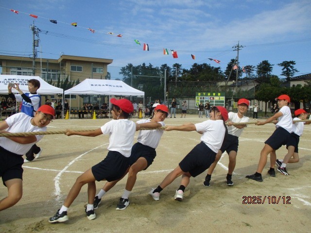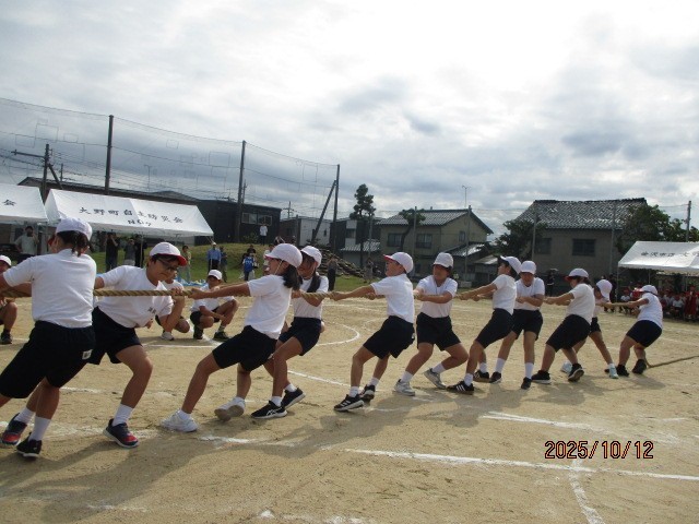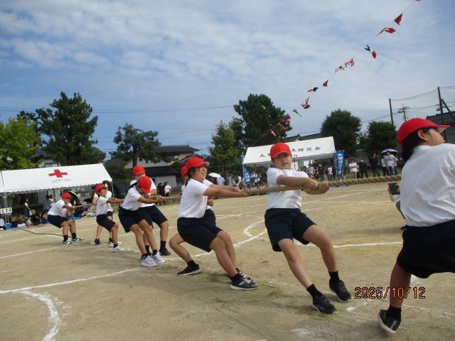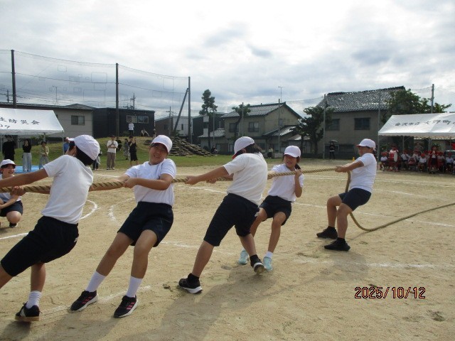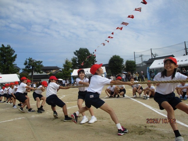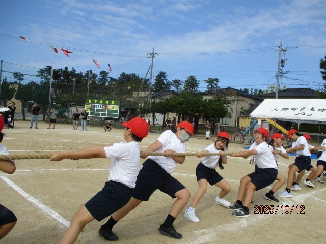 5.6年生が力いっぱい大綱を引っ張りました。1.2回戦は赤と白が1勝ずつで、3回戦に突入しました。3回戦は、大接戦でした。前半は赤が勝っていましたが、終了間際に逆転。白が勝利しました!