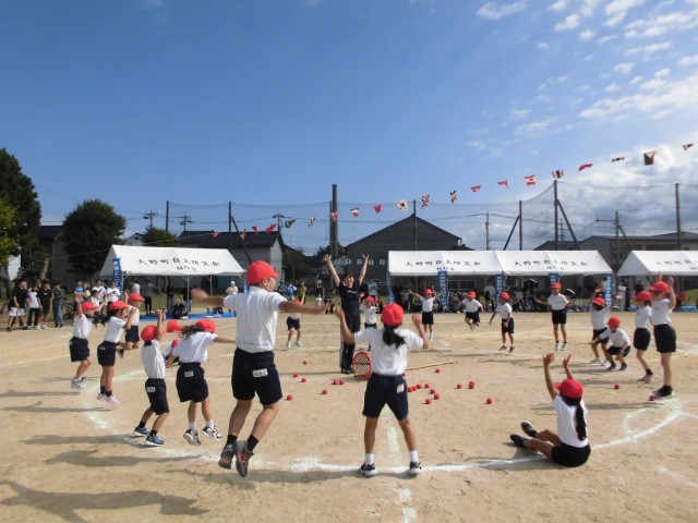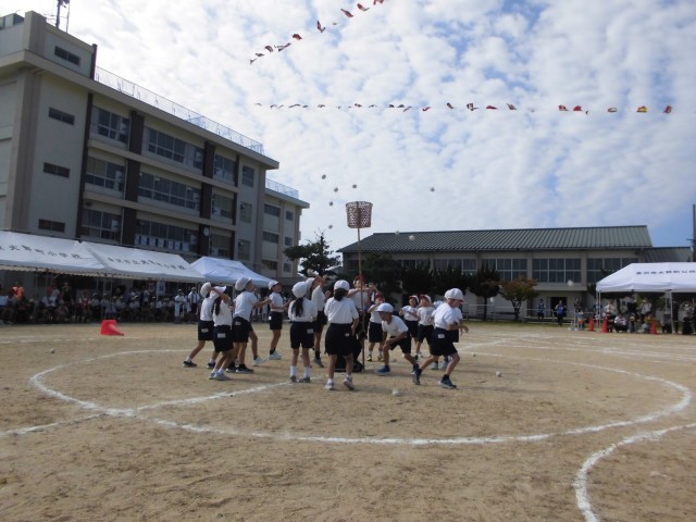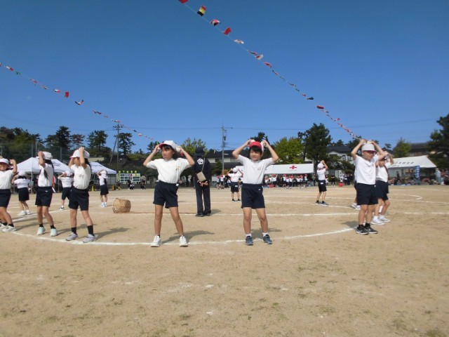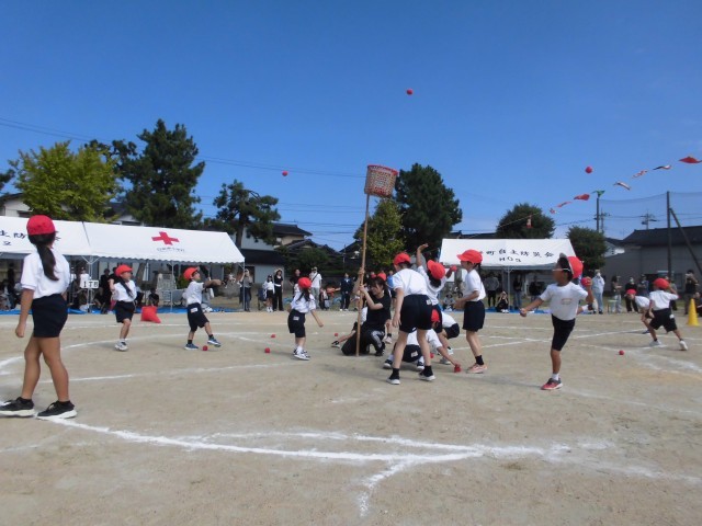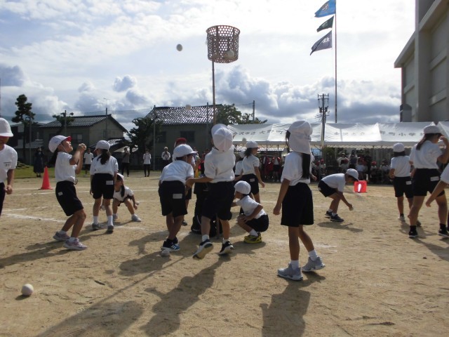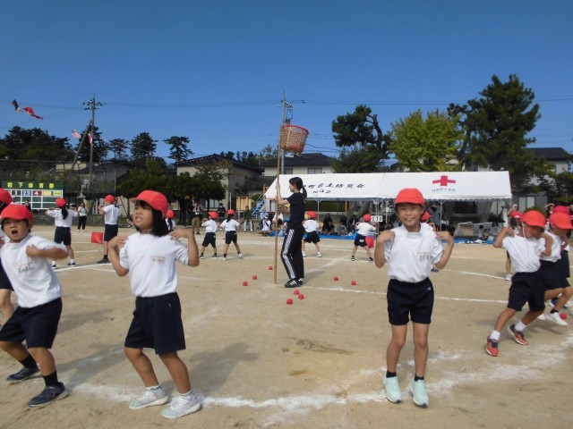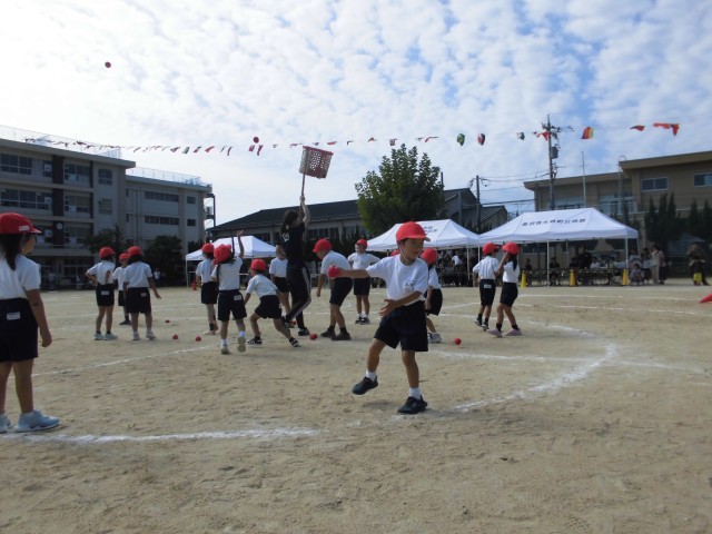 『チェッコリ』のダンスと『玉入れ』が一緒になった競技です。踊って、玉入れをして、また踊って、また玉入れをして、と1.2年生は大忙しでした。勝負の結果は「赤の勝ち!」。赤のみんなは大喜びでした。
