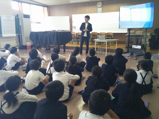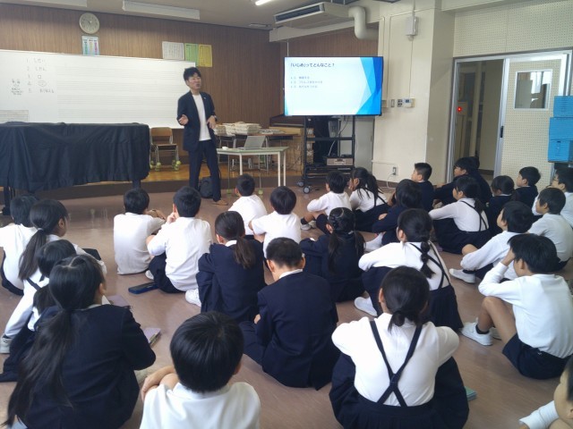 弁護士の井奈尚史氏を講師に、『いじめ防止講座』を開催しました。3限は3.4年生、4限は5.6年生がお話を聞きました。