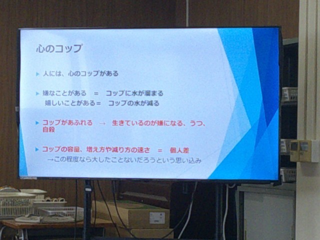 相手が「嫌だ」と感じたら「いじめ」であること、「いじめ」の初めはちょっとしたことがきっかけになることが多いこと、「心のコップ」の水があふれると病気になったり生きていることが嫌になることがあることなどを、わかりやすくお話してくださいました。また、いじめている人(加害者)も、ネット社会では生涯にわたっていじめの加害者であるという事実が消えずに残ることの怖さを知りました。