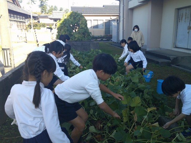 金沢市農業女性グループ(愛称:ノマジョ)の橘多美子先生(たみちゃん先生)にさつまいもほりについて教えていただき、1.2年生、あおぞら&やすらぎ学級のみんなでさつまいもほりをしました。
