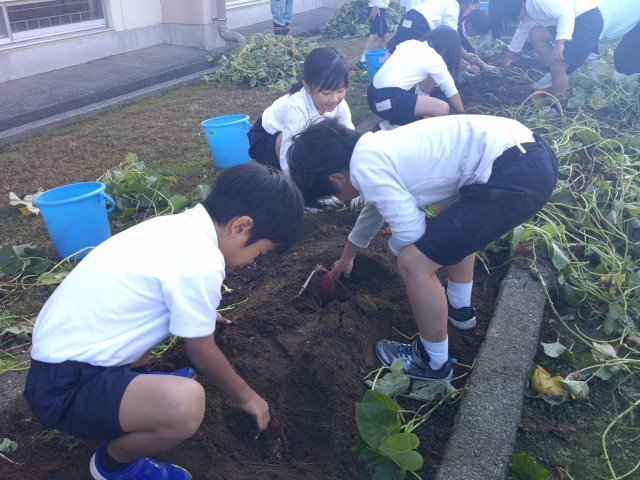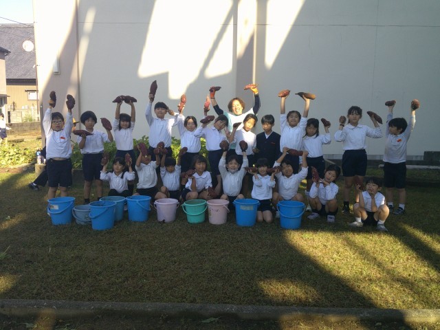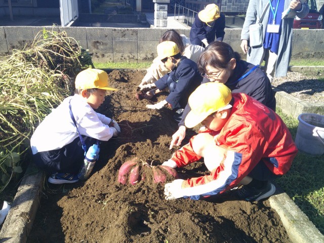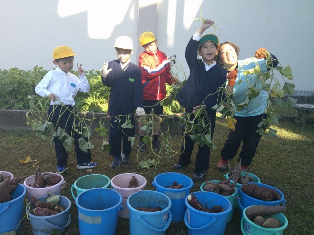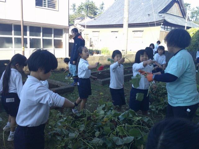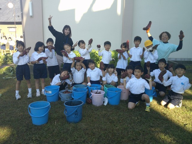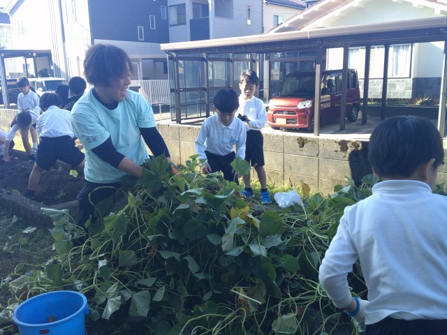ぐんぐんのびたさつまいものつるを引っ張るところから、全部自分たちでがんばりました。友だちと力を合わせてつるを引っ張ると、土の中からさつまいもが見えてきました。夢中で掘ると、みんなの水筒よりも大きなさつまいもがたくさん出てきました。畑のあちこちで、嬉しそうな歓声がたくさんあがっていました。