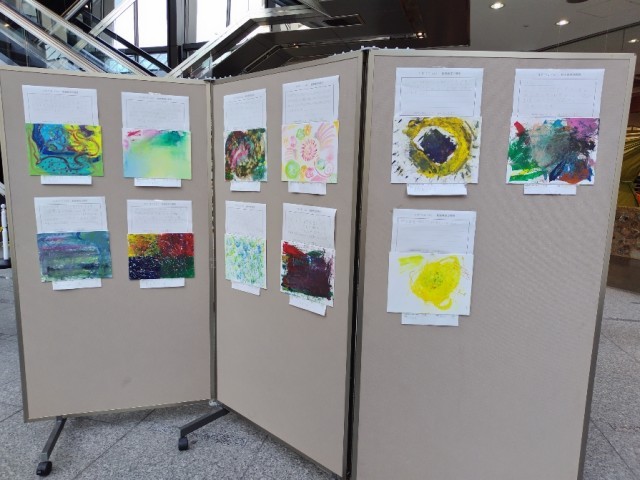 5.6年生が『現代アートリアル体験教室』で描いた作品がリファーレビル1Fアトリウム(8:00~20:00)で展示されています。通りがかりの人や、ベンチで休憩する人も、眺めて楽しめる場所です。