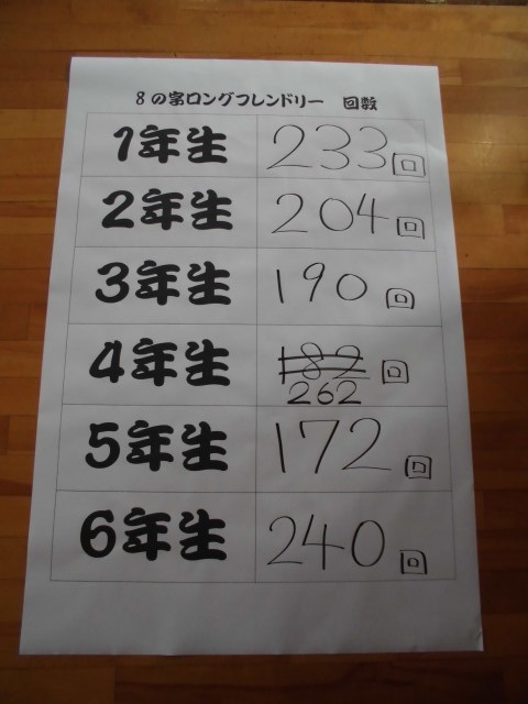 3分間が終わった後は、ドキドキする結果発表が待っていました。接戦を制したのは、ハンデの回数を合わせて、262回の4年生でした。「やったー!」と歓声があがりました。3年生からは、「(ハンデなしで240回もとんだ)6年生はすごい」という声も聞こえていました。全校で盛り上がった『8の字とび』でした。