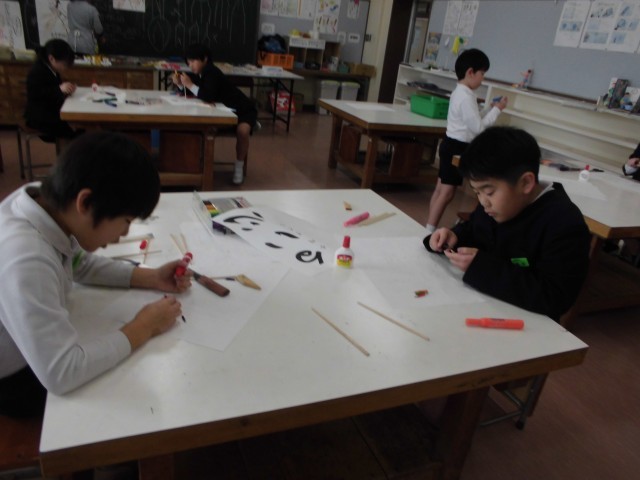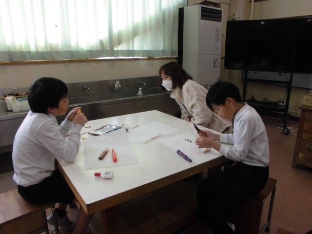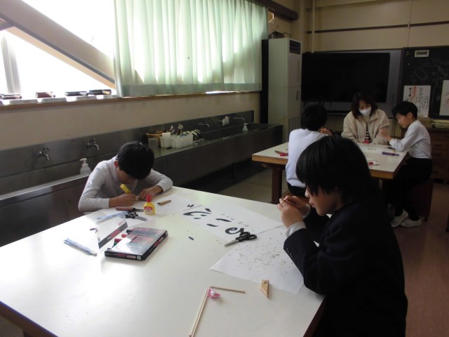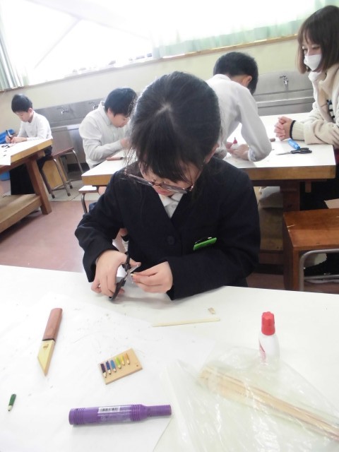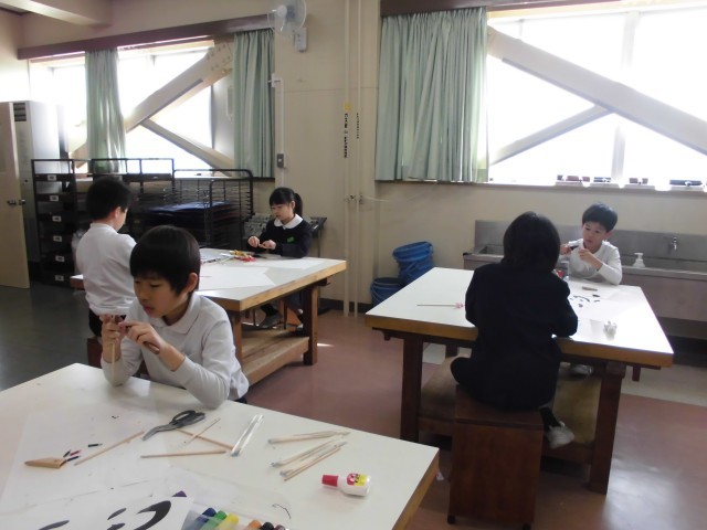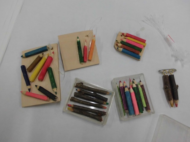 割り箸を鉛筆を削るように削って、ミニ鉛筆の飾りをたくさんつくりました。初めは小刀が上手く使えず、割り箸がどんどん短くなってしまったり、鉛筆の中心がすれてしまったりもしましたが、たくさん削るうちに、全員が自分できれいに削れるようになりました。細かな作業でしたが、集中して取り組み、何本もかわいい割り箸鉛筆ができあがりました。