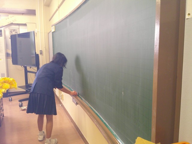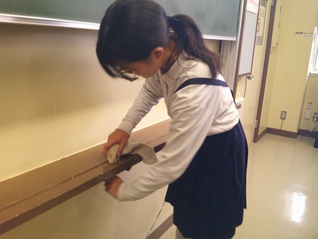 めったに掃除をすることがない水道管まで磨きに磨いてピカピカに。黒板もチョークの後が一つも残らないくらいきれいになりました。ビーカーや版画のローラーなど、みんなで使う物も丁寧に洗って、整頓して片付けました。次に使う人が気持ちよく使えそうです。