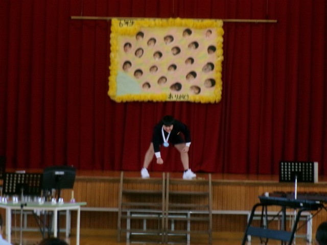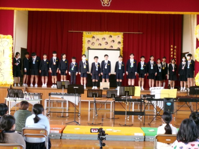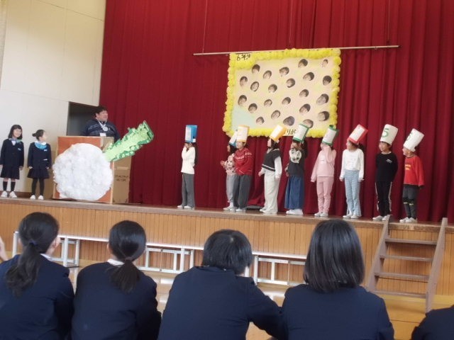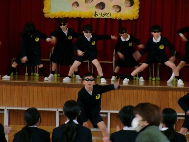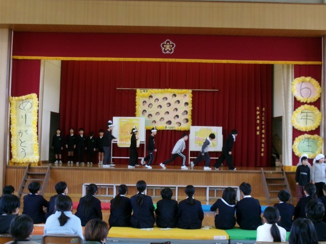 3年生→1年生→4年生→2年生→6年生と出し物が続きました。みんなの笑顔や拍手で盛り上がり、どの学年もリハーサルよりもずっと上手でした。サプライズは、他の学校に異動された先生から6年生へのメッセージ。6年生のみんなが、嬉しそうにVTRの画面を見入っていました。