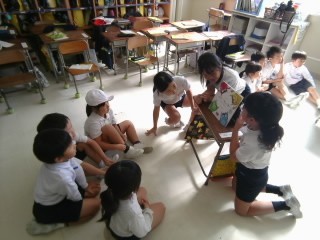 10月23日、1年1組と3年1組がたてわり交流会を行いました。交流会では、3年生が1年生に絵本の読み聞かせをしてくれました。また、お返しに1年生は国語で学習した「くじらぐも」の音読をしました。3年生は喜んでくれそうな楽しい絵本を選んだり、1年生は動作をつけたり読み方を工夫したりと、相手のことを思う気持ちが伝わってきました。優しい笑顔いっぱいのあたたかい交流会で、お互いにとてもうれしい気持ちになりました。