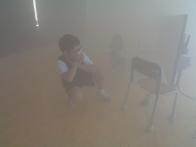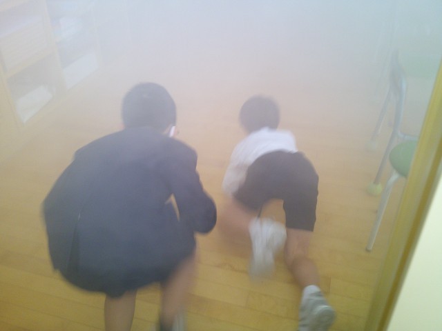 「けむりがどんな回り方をするのか」「けむりを吸わないようにするにはどうすればいいのか」を学び、けむりが充満する部屋に入りました。