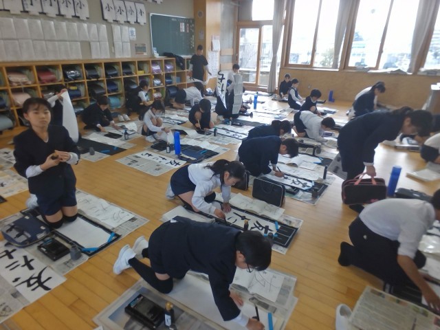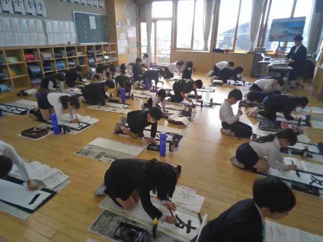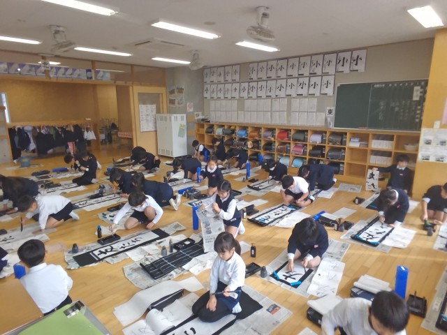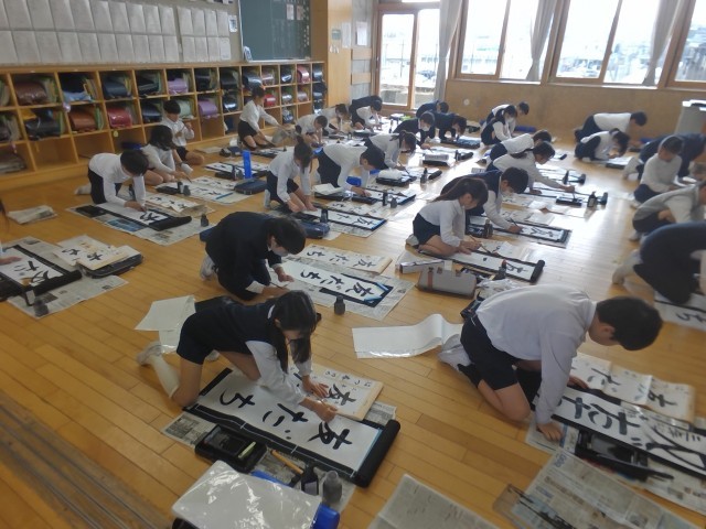 書き初め会では、心をこめて真剣に書く姿が見られました。