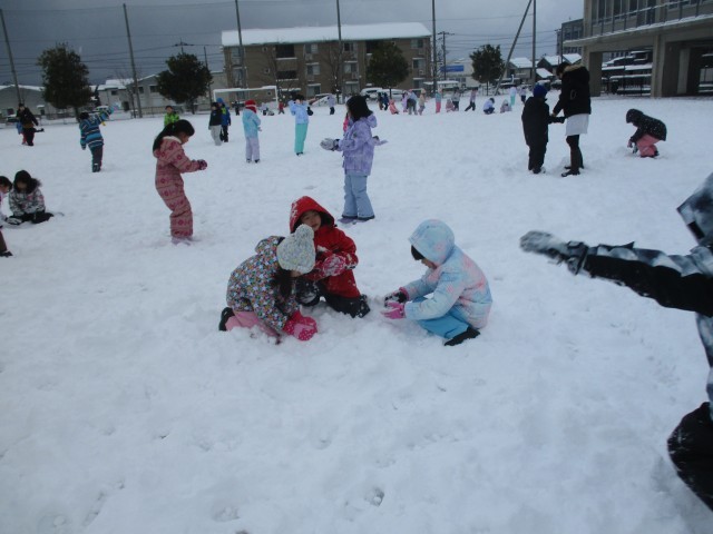 運動場にたくさんの雪が積もったので、みんなで雪遊びをしました。