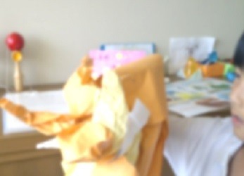 写真3は、低学年の子が、図工でつくった親指とそれ以外の指を紙の間に挟みパクパクさせる作品を私に見せに来てくれました。私の手もパクパクはさまれました。鋭い目が付いていたり、立体的な迫力ある角がついていたり、低学年らしい創造力が見られ微笑ましかったです。これこそチャレンジしている顔つきのパクパク作品でした。