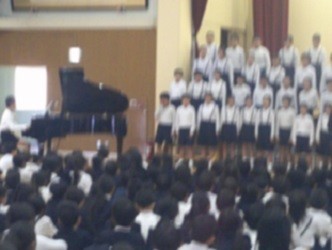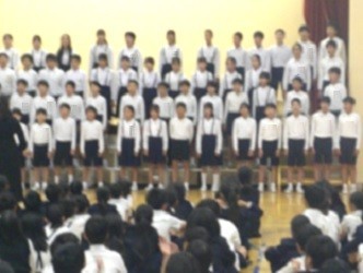 「音楽で楽しくなる、一つになる」を目標に頑張ってきただけあり、歌う子どもたちの顔は真剣そのもので、歌声が体育館に響きわたりました。私は斜め前から見ていたので、子どもたちが大きいく口をあけ歌っている姿が見れて、感動しました。見ていた子どもよい感想を伝えていました。