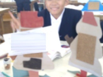 「秋の〇〇」、秋の最終として、高学年の図工をしてる様子を写真におさめました。段ボールや色画用紙、水彩等を使って、モニュメントのようなものを創っていました。ちょうど作品ができあがった頃で、グループで見合っていました(写真1)。写真2、写真3のように、嬉しそうに私に紹介してくれました。できて満足そうな表情になれるって、素敵なことだと思います。一人一人、つくるジャンルが異なっていて、子どもらしい表現でした。
