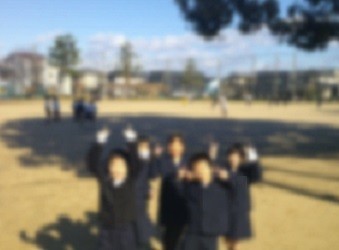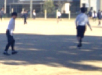 私も外に出てみました。すると、くすのきの下を走る子を見かけると(写真1)、ふと本校のシンボルツリーのくすのきに目が向きました。随分、太いなあ、冬なのに葉を茂らせている様子を見ていました。すると、次々にくすのきの影の上を走り抜けていきます(写真2)。そうやって見てると、「写真撮って」と言うので、くすのきの影が背景になるように撮りました(写真3)。
