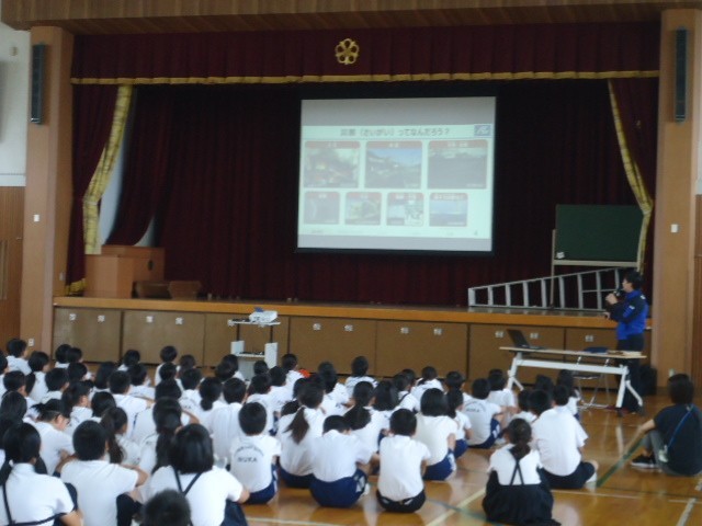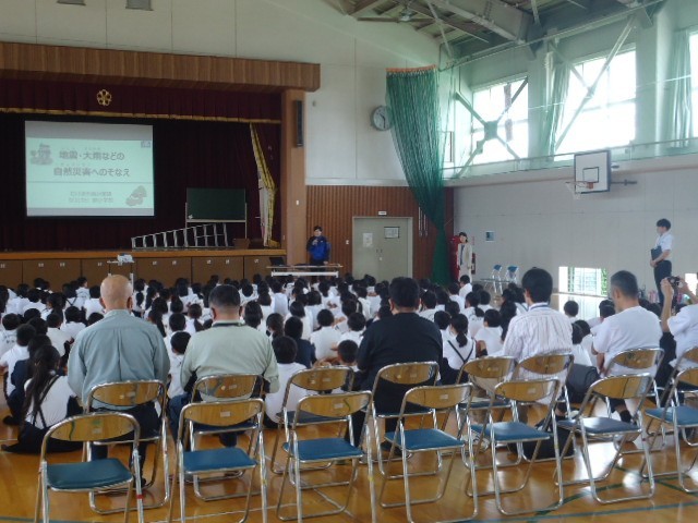 4,5,6年生が防災教育出前講座を受けました。県危機対策課の今村さんから地震と水害についてのお話がありました。どちらのお話もどれだけ準備をしっかりできているか、準備の大切さがよくわかるお話でした。