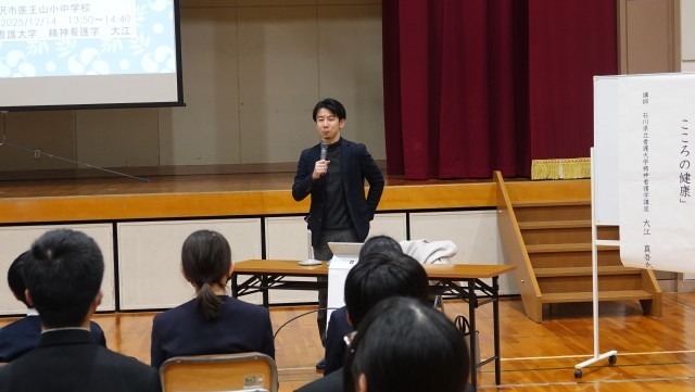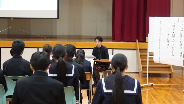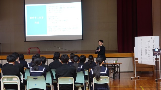 12月15日(月)には、小学校6年生から中学生、保護者を対象に県立看護大学の大江先生を講師に、「話す・聞くでつながるこころの健康」を演題にご講演いただきました。こころと身体がつながっていることや、前向きになるコミュニケーションのとりかたなどをわかりやすくお話ししてくださりました。