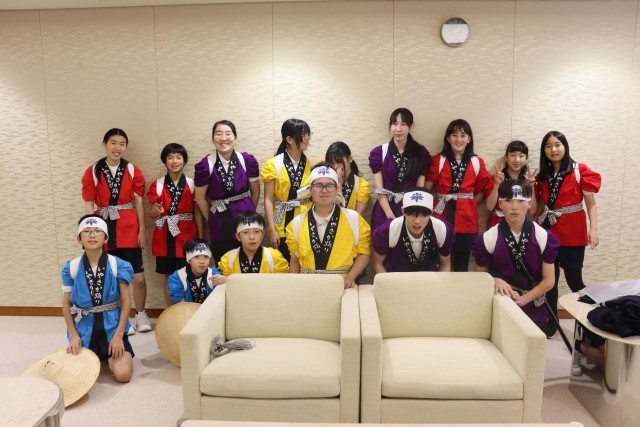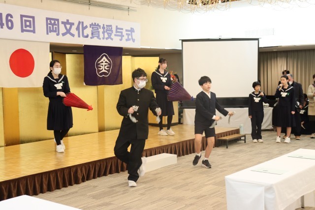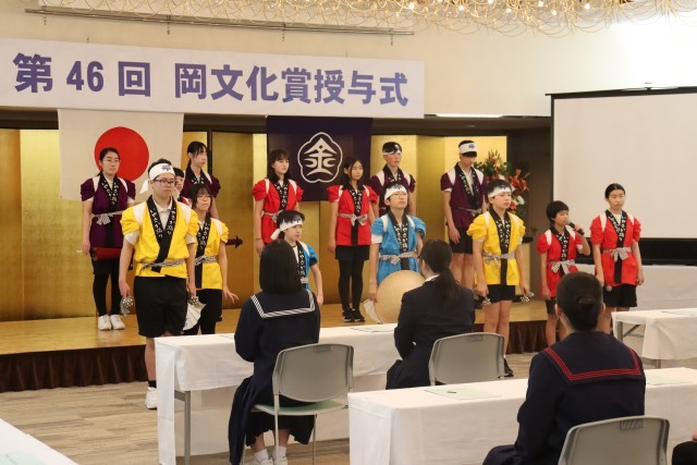 医王山小中学校の15人が授与式に先立ち、オープニング披露した演舞は立派な様子で、大変好評でした。