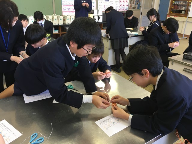 小学校6年生、中学校3年生が合同で水引をつくりました。難しい作品でしたが、悩みながら一生懸命作り上げました。