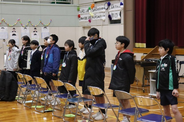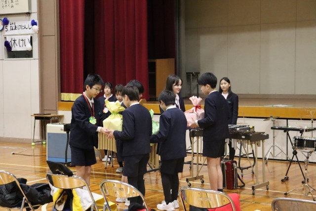 たくさんの期間準備した贈り物や出し物を、6年生のために披露しました。34年生は合奏、1遠征はダンスと歌、2年生は劇、5年生は思い出スライドショーを贈りました。6年生からも、お礼に「情熱大陸」の演奏と一生懸命作ったティッシュケースをお返しにプレゼントしました。最後に全校で「群青」を歌い、気持ちのこもった会となりました。