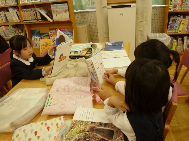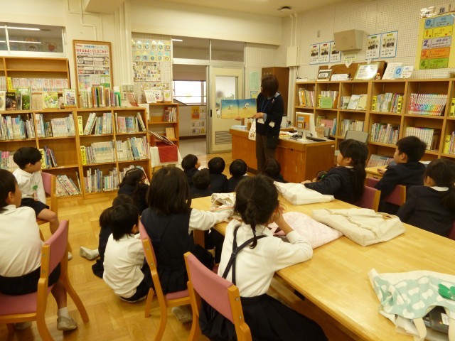 今日は1年生が大好きな図書館で読み聞かせをしてもらいました。