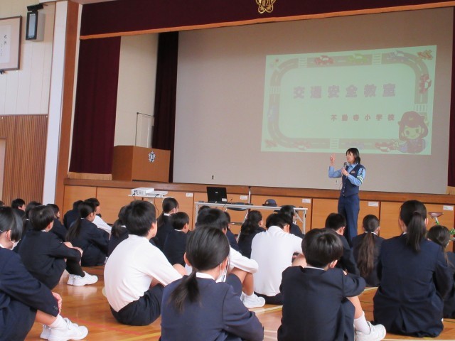 「交通安全教室」では、東警察署の方からお話をしていただきました。