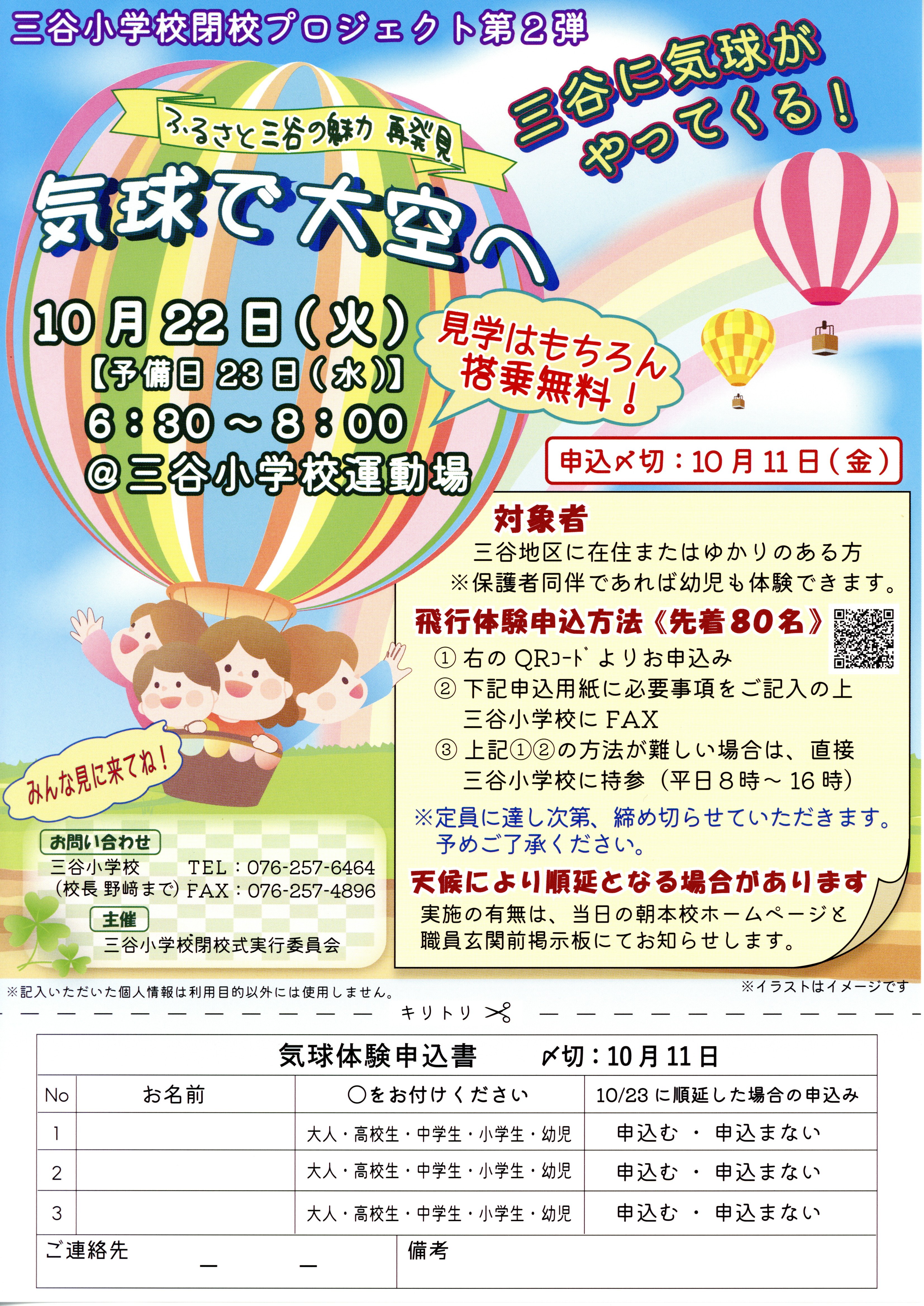 閉校プロジェクト第2弾として、気球の飛行体験を実施します。日時は10月22日(火)の6:30から8:00まで、会場は三谷小学校の運動場です。対象は三谷地区に在住またはゆかりのある方で、見学はもちろん気球への搭乗も無料です。事前に申し込みが必要で、先着80名までとさせていただきます。
